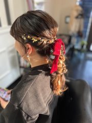 | 同窓会にオススメヘアアレンジ | ご来店頂きありがとう御座います🙌🏻 今回は、成人式後のヘアアレンジを 担当させて頂きました🌼 リボンがベロア生地である事から 可憐なセットとなっております🫧 ーーーーーーーーーーーーーーーーーーーー 当店では、髪飾りも販売しております🌼 お着物に合わせた、オーダーメイドの商品を ご用意しておりますので お悩みの際はお気軽にご相談下さい🙇🏻♡ |