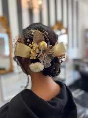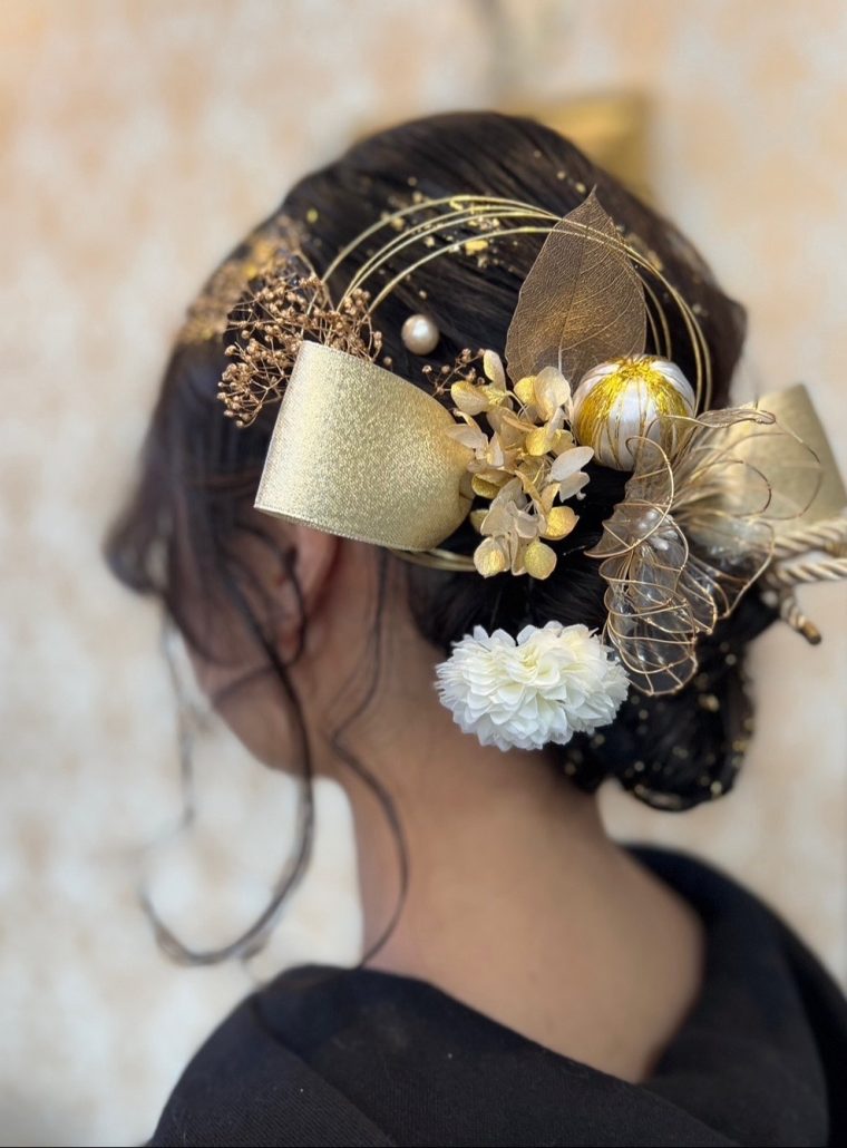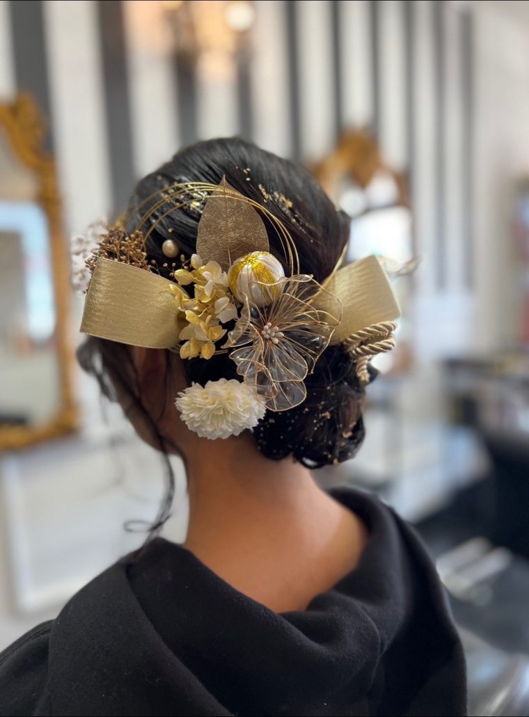 | 成人式にオススメのヘアセット🎗️✨ | ご来店頂きありがとう御座います🤲🏻 金箔や、金の水引きリボンがある事で より一層美しい仕上がりとなっております♡ ーーーーーーーーーーーーーーーーーーーー 当店では、紙飾りも販売しております💐 お着物に合わせた、オーダーメイドの商品を ご用意しておりますので お悩みの際はお気軽にご相談下さい🙇🏻 |