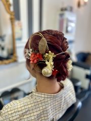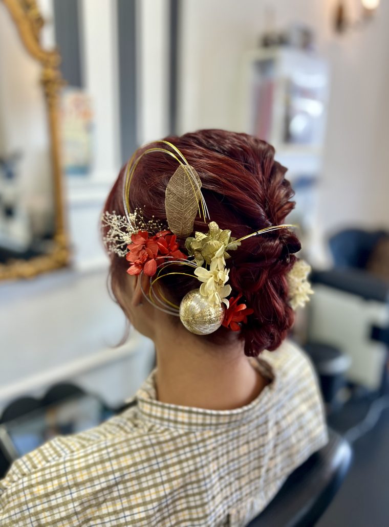 | 成人式にオススメヘアセット🌹 | ご来店頂きありがとう御座います🙌🏻 お客さまの髪色と、赤や金の 髪飾りが合っており、 華やかなセットとなりました✨ ーーーーーーーーーーーーーーーーーーー 当店では、髪飾りも販売しております💐 お着物に合わせた、オーダーメイドの商品を ご用意しておりますので お悩みの際はお気軽にご相談下さい🙇🏻 |