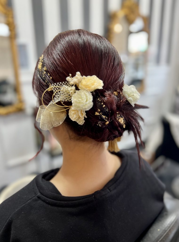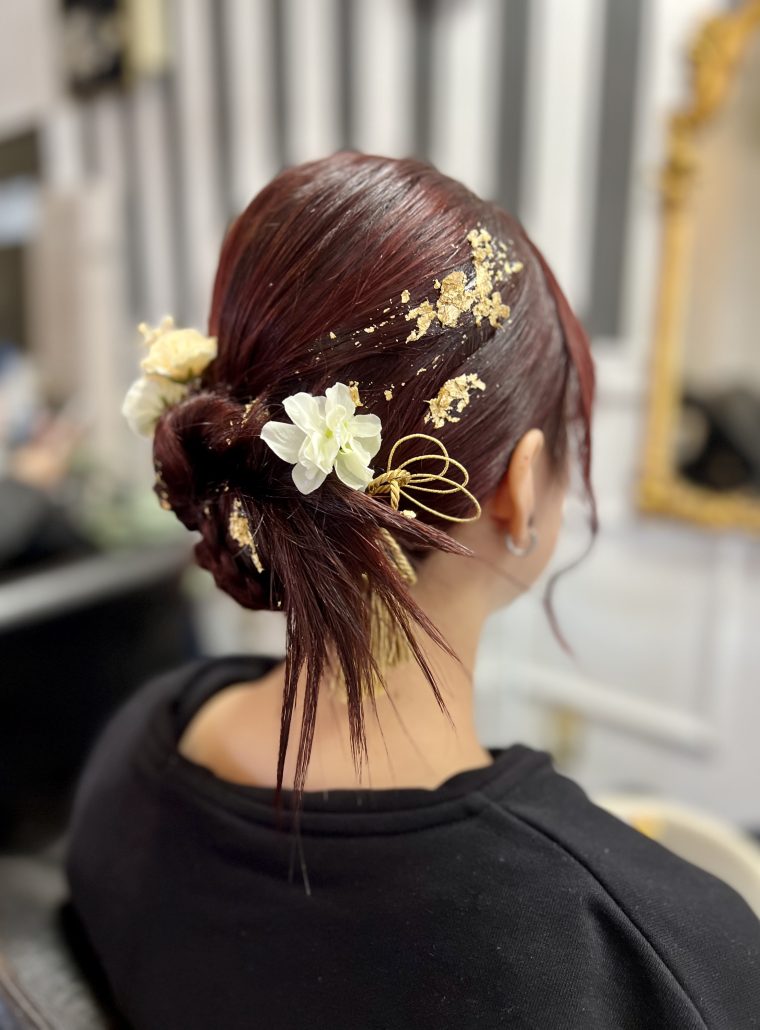 | 成人式のヘアセット🌹 | ご来店頂きありがとうございます🤲🏻 金箔もあることで、より華やかな仕上がりと なっております🙌🏻♡ ーーーーーーーーーーーーーーーーーーーーー 当店では髪飾りも販売しております💐 お着物に合わせたオーダーメイドの 商品をご用意しておりますので、 お悩みの際はお気軽にお電話ください🙇🏻💕 |