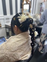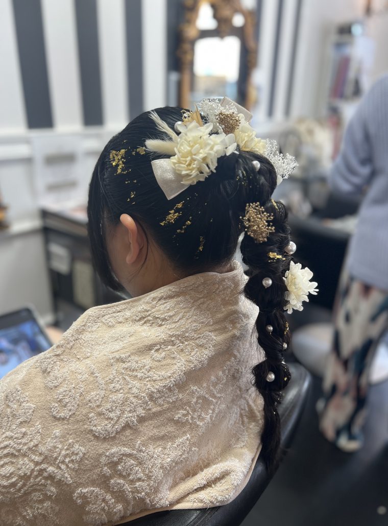 | 成人式にオススメのヘアセット✨ | ご来店頂きありがとうございます🤲🏻 金箔も散りばめられている事で、より美しい 仕上がりですね♡ ーーーーーーーーーーーーーーーーーーーーー 当店では、髪飾りも販売しております🌼 お着物に合わせた、オーダーメイドの商品を ご用意しておりますので、お悩みの際は お気軽にご相談ください🙇🏻🤍 |