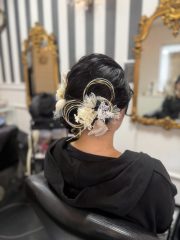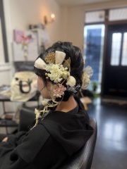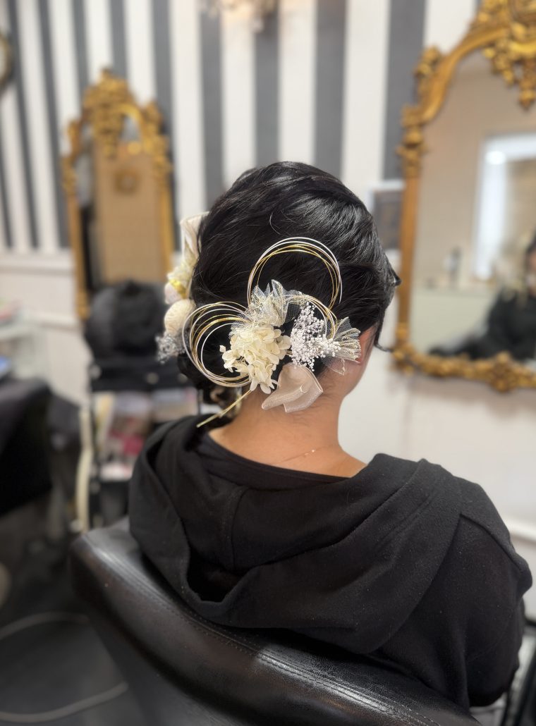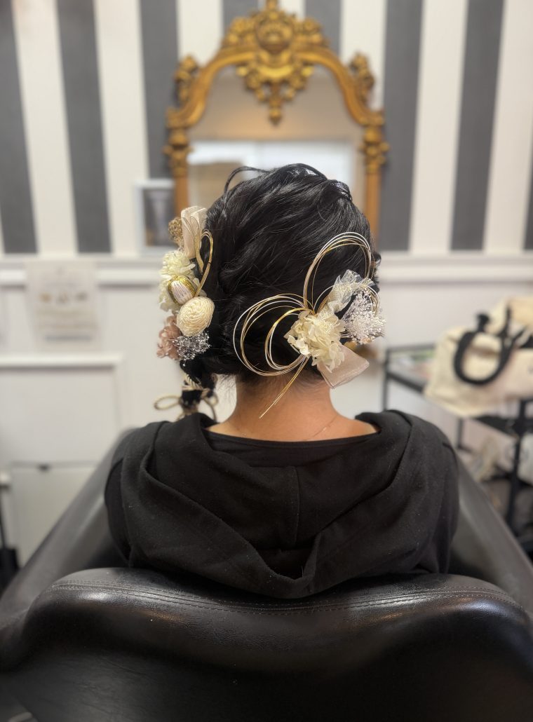 - ベージュやホワイトを基調としたお花の髪飾りに、ゴールドのリボンや水引きを合わせた華やかな雰囲気にもぴったりのヘアセットとなりました🌸