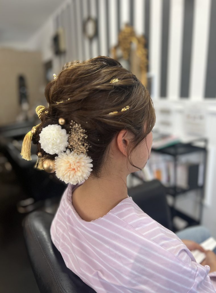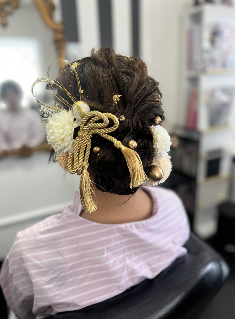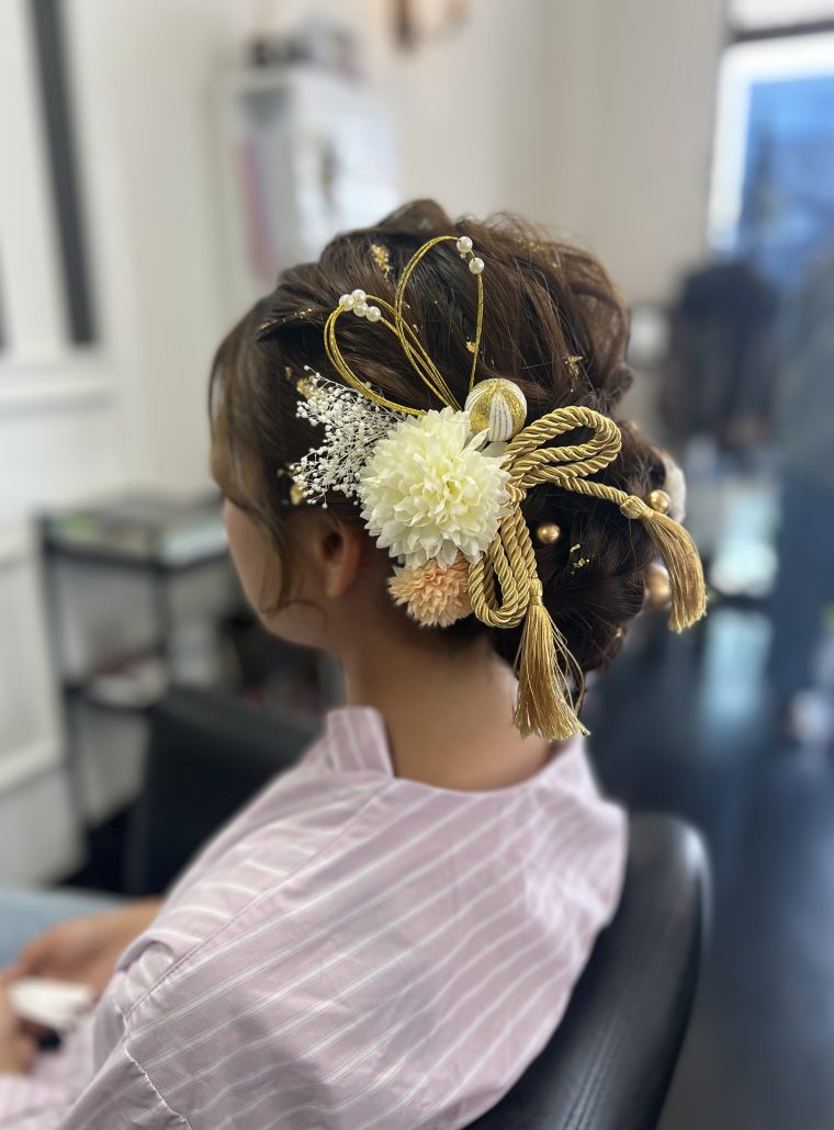 | 成人式にオススメのヘアセット💐🫧 | ご来店頂きありがとうございます🙌🏻 金のロープの髪飾りがある事で、 可愛らしく美しいセットとなっております♡ ————————————————————— 当店では、髪飾りも販売しております🌼 お客様のお着物に合わせた、 オーダーメイドの商品を ご用意しておりますので、 お悩みの際はお気軽にご相談ください🤲🏻 |