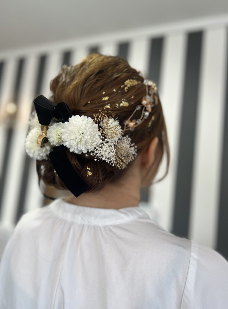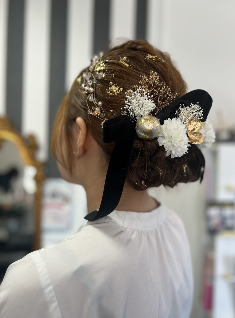 | 成人式にオススメのヘアセット🫧🎗️ | ご来店頂きありがとう御座います🙇🏻 霞草や、金箔がある事でより一層美しい セットとなっております🪻 ーーーーーーーーーーーーーーーーーーーー 当店は、髪飾りも販売しております💐 お着物に合わせた、オーダーメイドの商品を ご用意しておりますので お悩みの際はお気軽にご相談下さい🤲🏻 |