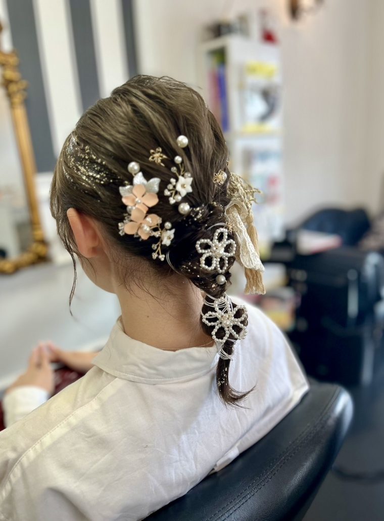 | 成人式のヘアセット | パールや金の花の髪飾が 散りばめていることで、どこから見ても 華やかなセットとなっております🌼✨ ご来店頂きありがとうございました🙇🏻💕 ーーーーーーーーーーーーーーーーーーーー 当店では、髪飾りも販売しております💐 お着物に合わせたオーダーメイドの 商品をご用意しておりますので、 お悩みの際はお気軽にお電話ください🙌🏻💕 |